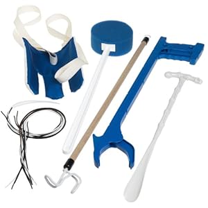 The deluxe reach assist kit includes the most popular assistive devices for people recovering from hip, knee or back surgery. Helps to maintain independence while limiting the need to bend. Includes: long handled sponge (22-1/2"), reacher (24"), long shoehorn with "T" handle (19-1/2"), deluxe sock and stocking aid with 29" straps, elastic shoelaces (1 pair each of White 30", black 24", Brown 24").