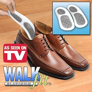 New and improved design! NEW! We've added a unique gel pad to our Bio-Lock heel cup for advanced cushioning and shock absorption. So you get cushioning where you need it and firmness where you need it! NEW! Patented Nano-Silver technology kills germs and odors on the spot Realigns your spine and pelvic area to reduce knee, hip and lower back pain. Independent clinical study showed Walkfit technology relieved foot pain in 90% of users. NEW WalkFit Platinum orthotics takes comfort and stability to the next level with extra cushioning and odor protection. See how the world's #1 custom-fitted orthotic can improve your life Walkfits help reduce pain in feet, knees, hips, and back. Each pair of WalkFit insoles comes with 3 customizable arch inserts, low, medium, and high. Once your feet have adjusted to the WalkFit Orthotics, you will experience a noticeable increase in foot support and comfort. Available in mens sizes 6 through 14 1/2 and womens sizes 5 through 12 1/2